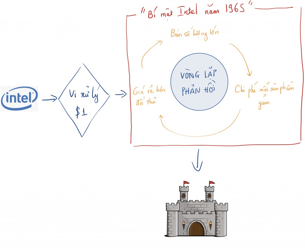 Hay việc Intel chủ động bán những con chip máy tính $1 đầu tiên vào năm 1965, một mức giá mà Intel gánh lỗ, gây rúng động cả thế giới lúc bấy giờ. Có ai ngờ bí mật của Intel là muốn đạt quy mô sản xuất sớm nhất thị trường để kích hoạt vòng lặp phản hồi: bán nhiều => khối lượng bán ra lớn => máy móc hiện đại => chi phí sản xuất rẻ lại => bán được nhiều hơn => khối lượng bán ra lớn hơn nữa => chi phí sản xuất rẻ hơn nữa =>… Vòng lặp phản hồi này giúp Intel sớm đạt được chi phí sản xuất vượt xa mọi đối thủ. Ở thời điểm năm 1965, đây là nước cờ mới mẻ, độc đáo, thiên tài, mà năm 2021 đã là chuẩn cờ cơ bản trong quyển sách chiến lược của tất cả công ty. Không hề gì với Intel. Intel đã chiến thắng rồi, ít nhất là trong giai đoạn 1965 đến 2010.