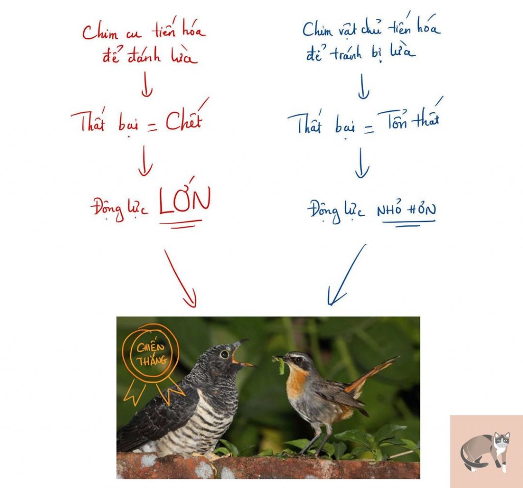 Chim cu chiến thắng vì nó không được phép thua. Mỗi con chim cu thất bại trong việc lừa chim bố mẹ vật chủ sẽ triệt sản và không thể duy trì bộ di truyền của mình. Vì vậy mà mỗi con chim cu còn sống sót và sinh sản theo thời gian được chọn lọc rất mạnh bởi quy luật tiến hoá để chiến thắng trong trò chơi này. Ngược lại, tuy loài chim bố mẹ vật chủ không mong muốn bị lợi dụng nhưng việc không phát hiện được trứng chim cu trong tổ chỉ là mất mát một phần, nó vẫn có thể tồn tại sinh sản và duy trì bộ di truyền trong các thế hệ sau.