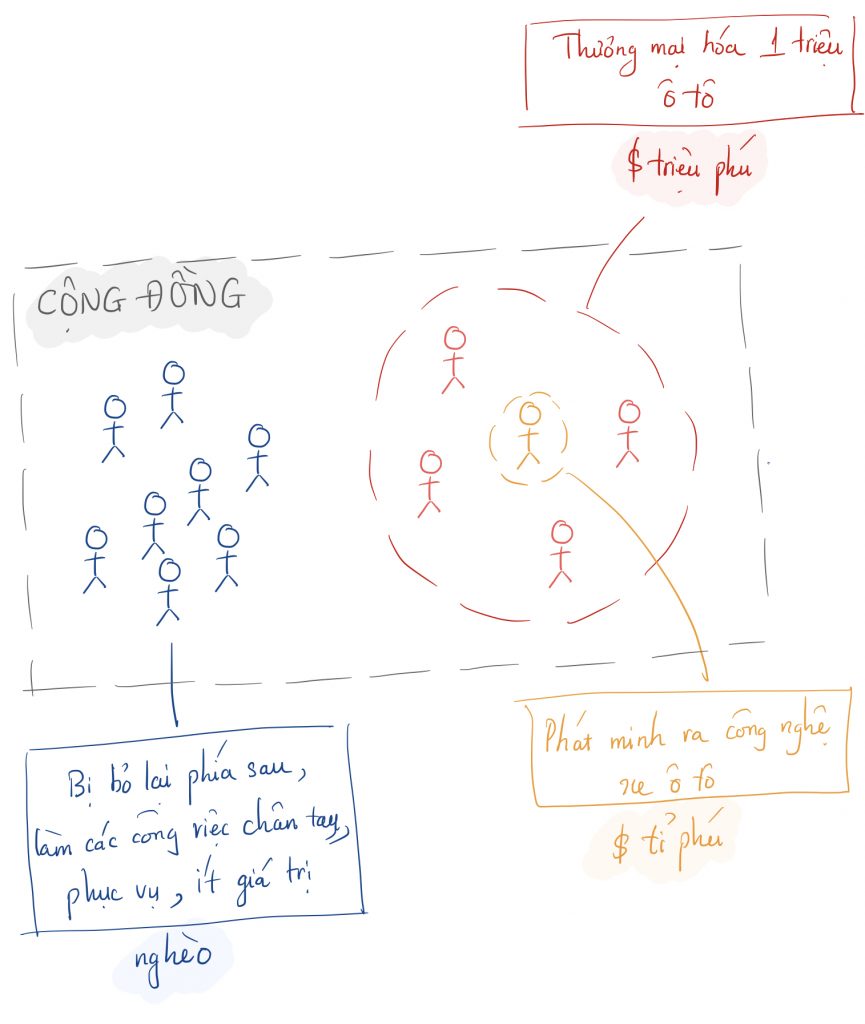 Cách cả thế giới tự động hoá đang mặc nhiên biến một vài cá nhân then chốt công nghệ thành tỉ phú, và một loạt các vệ tinh xung quanh như gia đình, bạn bè, các quan chức, các nhân viên đầu tiên, các đối tác đầu tiên... thành triệu phú. Cá nhân tỉ phú không hoàn toàn tự họ mà phát minh nên không nên tự mãn. Họ sinh ra đúng thời điểm, có tố chất có tính kinh tế cao, được sự hỗ trợ của bao nhiêu công trình khoa học đi trước, được nuôi sống bởi vận hành của cả xã hội. Còn các vệ tinh chỉ ăn theo thì càng không nên tự mãn vì vai trò thực sự của họ càng ít quan trọng. Nếu là người khác năng lực trung bình ở vị trí của họ thì cũng sẽ đạt được kết quả y chang.