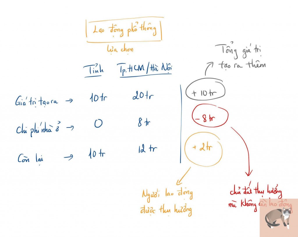 150 năm sau, Tp.HCM và Hà Nội trở thành London số 2, tạo ra rất nhiều cơ hội cho rất ít những người có điều kiện về vốn, tài sản gia đình có sẵn, kiến thức,… để nắm bắt. Gốc rễ của giá trị bất động sản tăng phi mã là phát triển kinh tế đô thị. Phát triển kinh tế được tạo ra từ đóng góp của tất cả, từ việc tập trung lượng lớn dân cư trong một diện tích nhỏ cho phép năng suất mỗi người tăng cao vượt bậc. Hàng quán ở tỉnh có thể có vài chục khách mỗi ngày nhưng hàng quán ở Tp.HCM và Hà Nội tiếp cận thị trường 10 triệu dân có thể có vài trăm hoặc vài ngàn khách mỗi ngày. Các khu công nghiệp tập trung cho phép đầu tư máy móc, thiết bị hiện đại với đầy đủ nhà cung cấp và cơ sở hạ tầng trong bán kính vài km: sắt thép, gỗ, vải, lực lượng bán hàng, xe tải, đường cao tốc/xa lộ,…
