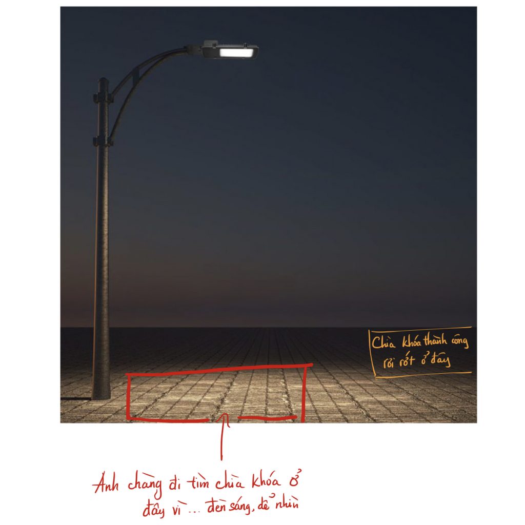 Có anh chàng say xỉn nọ chẳng may đánh rớt chìa khoá nhà. Trời đã tối mịt mà đoạn đường anh làm rớt chìa cũng chỉ có mỗi một ngọn đèn đường, chiếu thành một đốm sáng nhỏ trên mặt đất. Một người đi đường ngang qua thấy anh loay hoay mãi tìm nên tò mò hỏi: “Anh làm rớt chìa khoá ngay đây à?” . Anh chàng bèn chỉ tay vào khoảng sân tối mịt ngoài xa xa, trả lời: “À không, tôi làm rớt lúc đang ở ngoài kia. Mà chỉ có chỗ này sáng sủa để tìm nên tôi tìm mãi, mà không hiểu sao tìm vẫn chưa ra” ?