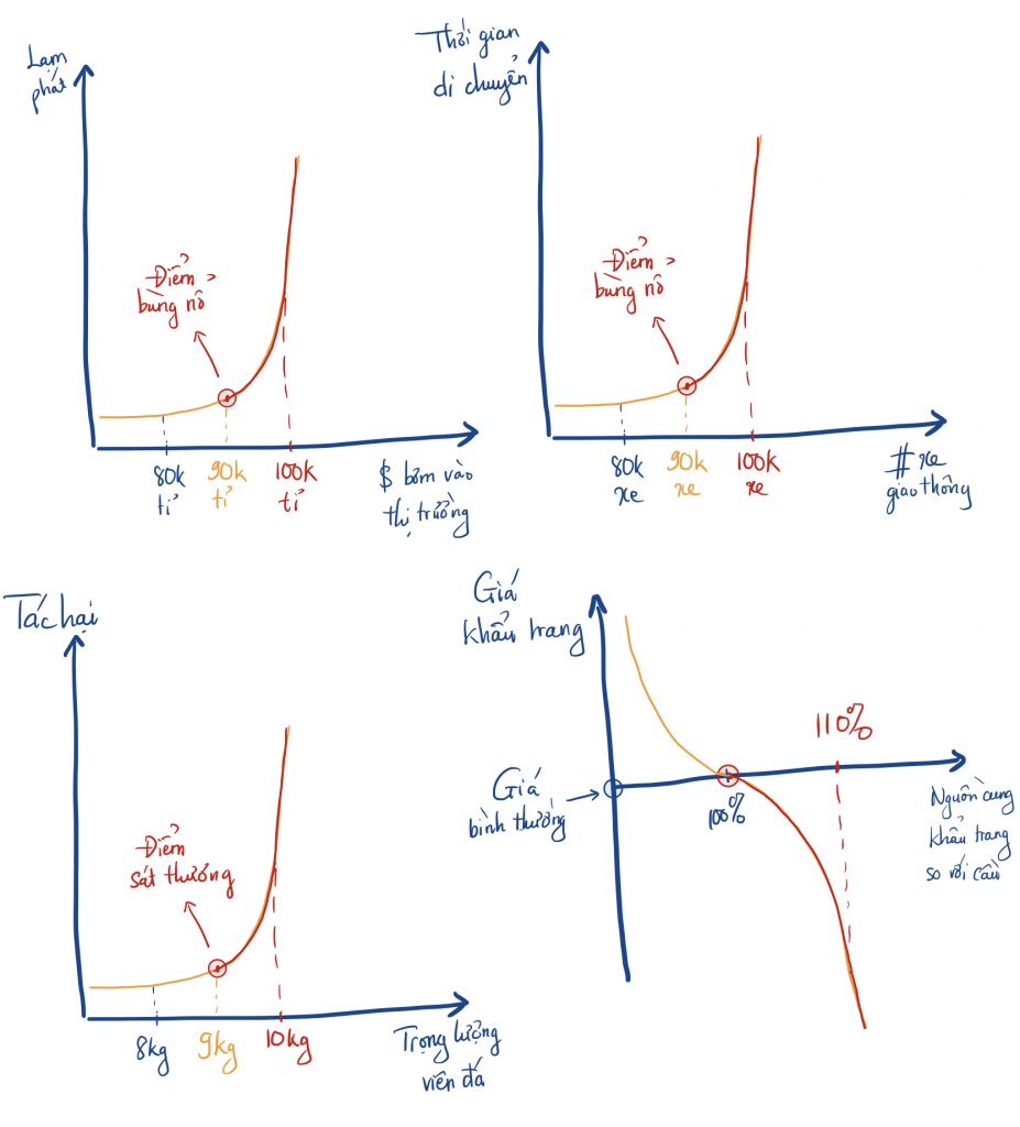 Vàng, chứng khoán, bất động sản, lưu lượng giao thông, hay cả khẩu trang... có một điểm chung là hàng ngàn viên đá nhỏ không tạo nên đột biến dù tổng trọng lượng của những viên đá này tương đương một tảng đá lớn. Chính phủ bơm 10,000 tỉ/năm vào nền kinh tế đều đặn trong 10 năm khác với bơm 100,000 tỉ vào 1 năm 2020 duy nhất và không bơm trong những năm còn lại. Ví dụ nguồn cầu mua bất động sản vượt nguồn cung 1% có thể dẫn đến giá bất động sản tăng 2%, nhưng vượt nguồn cung 10% có thể dẫn đến giá bất động sản tăng gấp đôi. Và ngược lại. Hoặc lưu lượng giao thông vượt 10% so với ngưỡng gây ùn tắc có thể dẫn đến thời gian di chuyển hành trình tăng gấp 3-4 lần so với bình thường.