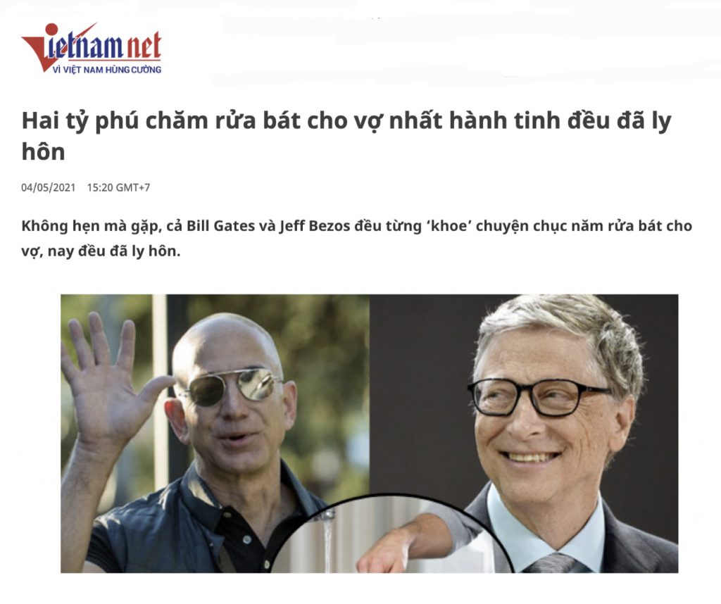 "Cùng rửa chén mỗi tối và các cột mốc 27 năm hôn nhân nhà Bill Gates. Vụ tỉ phú Mỹ Bill Gates và vợ Melinda tuyên bố ly hôn đã gây chấn động thế giới. Hãy cùng nhìn lại cuộc hôn nhân 27 năm của họ, từ lúc gặp gỡ, tới lúc có con và cùng nhau làm từ thiện. Ngày 3-5, tỉ phú sáng lập Microsoft thông báo ly hôn với vợ là bà Melinda sau 27 năm chung sống. "Trong 27 năm qua, chúng tôi đã nuôi dưỡng 3 người con tuyệt vời và xây dựng một quỹ hoạt động trên toàn thế giới, giúp tất cả mọi người được sống khỏe mạnh và hiệu quả", ông Bill Gates viết trên Twitter. - Tuổi Trẻ Online 4/5/2021