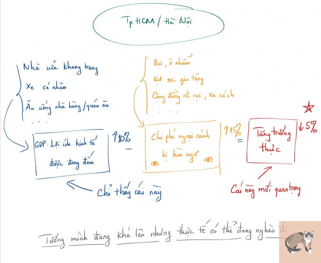 Quản lý kinh tế đô thị ở khắp thế giới cũng vậy, mãi chạy theo con số tăng trưởng GDP mà không tính toán, định lượng được cái “hạnh phúc” dù cho cái đó là cái cuối cùng cả xã hội theo đuổi. Nhà cao tầng thay thế mảng cây xanh, nhà máy gây ồn, khói xe, bụi, ô nhiễm, kẹt xe, cộng đồng xa cách,… tất cả đều nằm trong cái “ngoại cảnh” và không được trừ lại khi tổng kết cái “tăng trưởng kinh tế thành phố” báo cáo mỗi cuối năm. Thành phố được báo cáo “tăng trưởng 2 chữ số” suốt nhiều năm còn các “chi phí ngoại cảnh” này cứ chất chồng mà tàng hình không ai để ý. Chất lượng cuộc sống đô thị vĩ đại như Tp.HCM/Hà Nội có còn thực sự được cải thiện hàng năm, trong khi GDP vẫn tăng trưởng khủng?