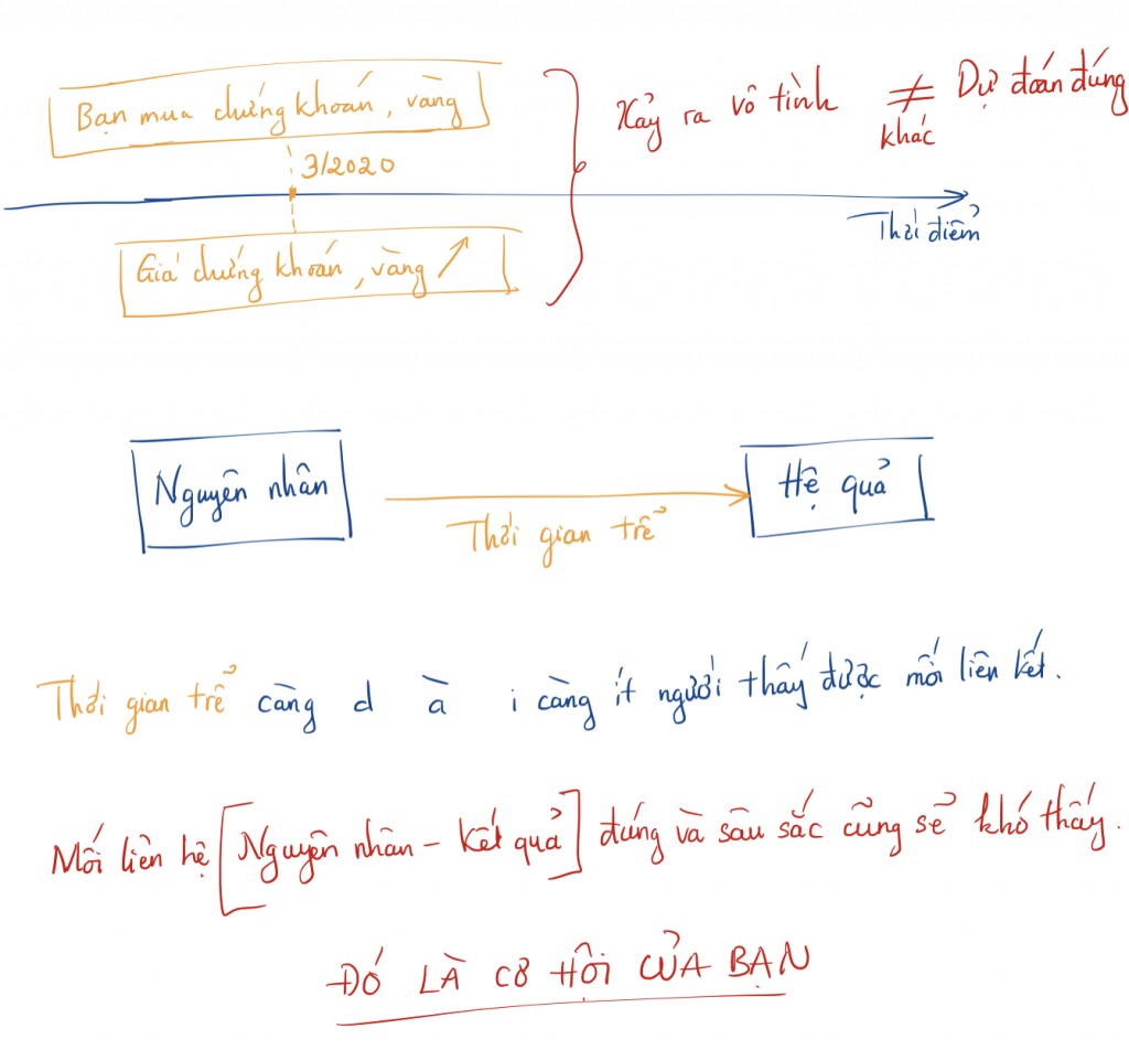 Nhìn vào tương lai lúc nào cũng khó nhưng khi nhìn lại thì ai cũng thấy mọi chuyện hiển nhiên. Hiển nhiên không giao thương, kinh tế trì trệ, ngân hàng nhà nước bơm tiền cứu trợ khối lượng nghìn nghìn tỉ thì sẽ tăng rủi ro lạm phát, dẫn tới các tài sản như chứng khoán, vàng trở thành bến đỗ cho các nguồn tiền mặt này và tăng giá. Thế nhưng, giá chứng khoán và vàng sẽ tăng thực sự có hiển nhiên vào tháng 3/2020? Ai may mắn hưởng lợi rồi có xu hướng nghĩ là mình phán đoán giỏi. Việc phán đoán giá vàng và thị trường chứng khoán trong ngắn hạn là một việc rất khó, chỉ một vài tổ chức/cá nhân đặc biệt làm được, như vận động viên đủ năng lực giành huy chương vàng Olympic. Đa số còn lại sẽ thua cuộc.